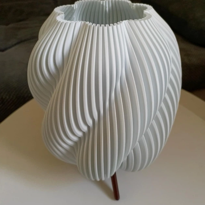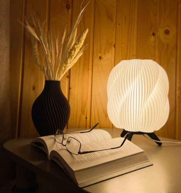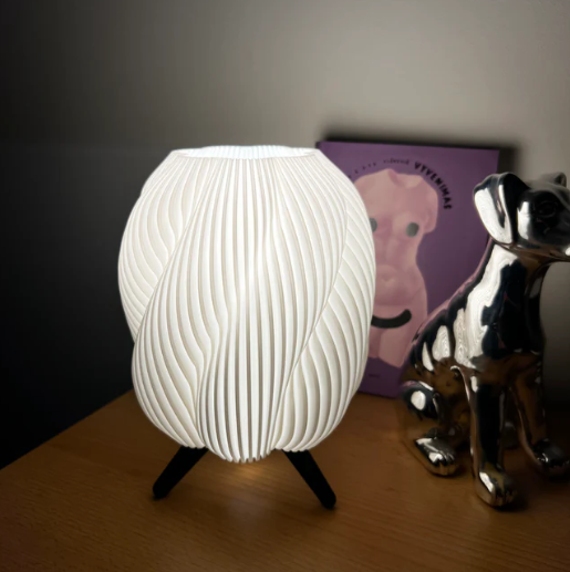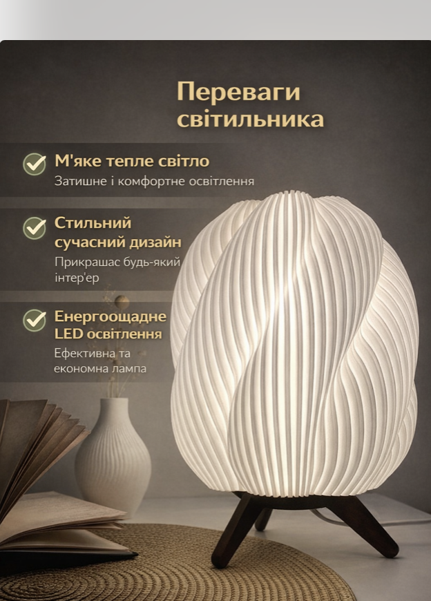 Настільний дизайнерський світильник, виготовлений методом 3D-друку з екологічного PLA-пластику, — це поєднання сучасного дизайну, функціональності та затишку. Його органічна хвиляста форма створює м’яке, розсіяне світло, яке не сліпить очі та ідеально підходить для вечірнього відпочинку, читання або створення теплої атмосфери в кімнаті.
